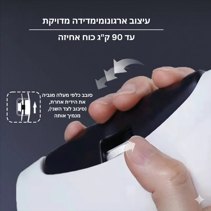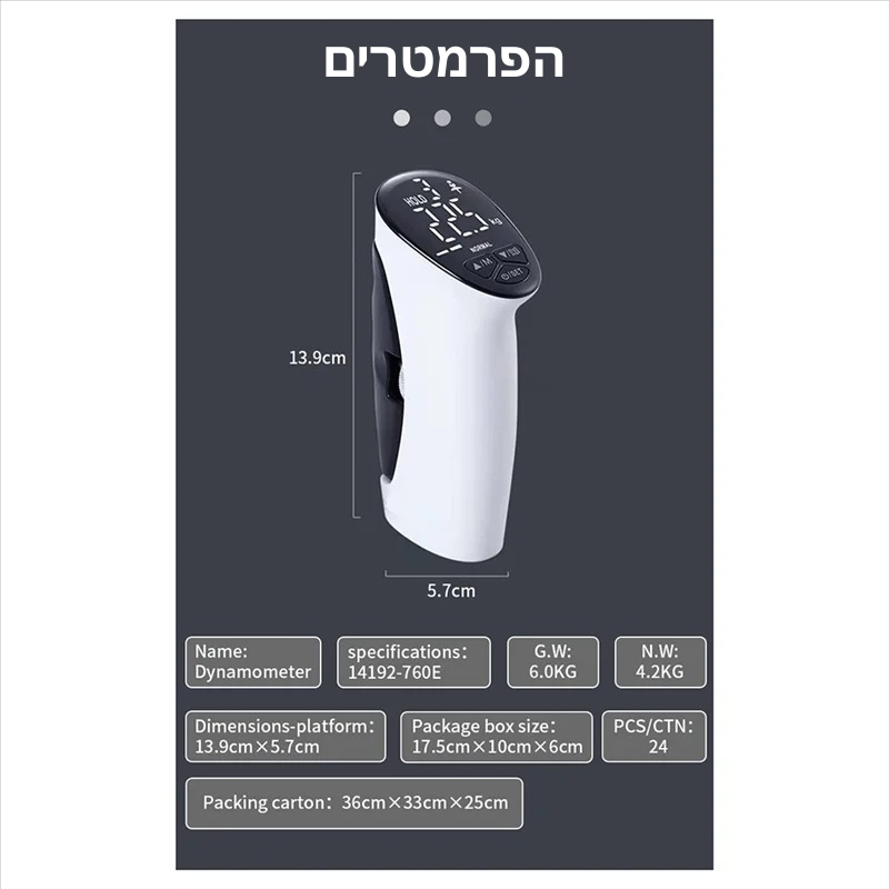זה מד כוח אחיזה עם עיצוב ארגונומי חכם, שמתאים את עצמו ליד שלך בדיוק. אתה מסובב את הגלגל, האחיזה מתכווננת, והיד יושבת בצורה טבעית ונוחה.